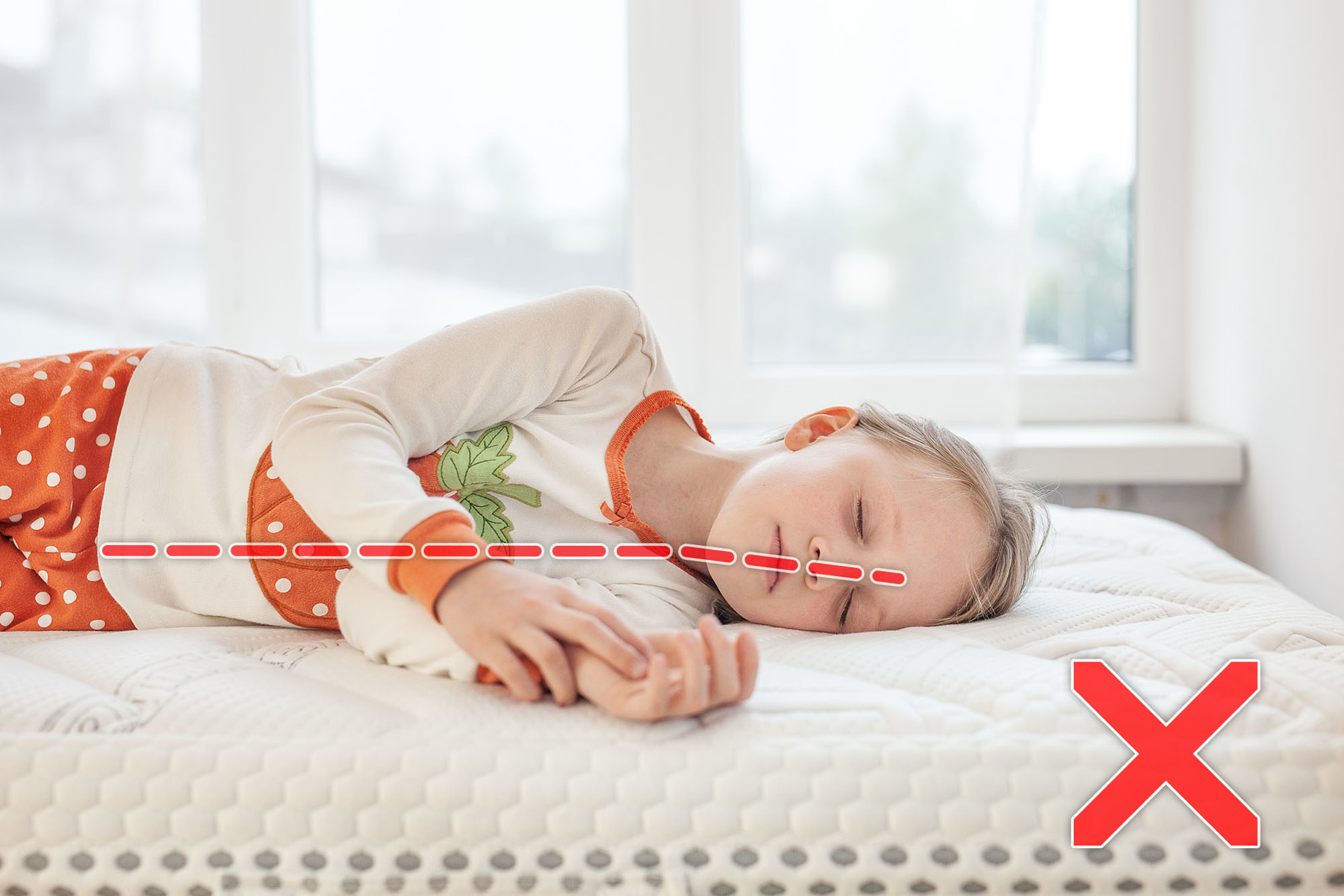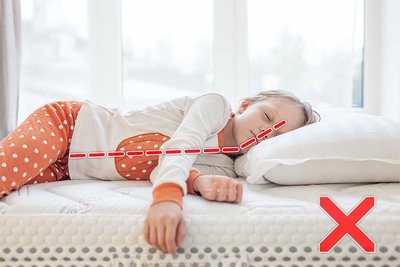 Zbyt wysoka poduszka powoduje uniesienie głowy dziecka w górę i silne nienaturalne wygięcie kręgosłupa szyjnego. Efektami tego są poranne bóle szyi, nieprawidłowa nocna regeneracja, nieskuteczny sen - przez skróconą fazę snu głębokiegio. Bezpieczna poduszka to konstrukcja która jest przemyślana a jej parametry powstały na podstawie doświadczeń. Poniżej przykład użycia takiej poduszki: